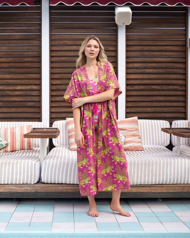 Photo of a woman wearing a bold pink and green print featuring tigers classic one-piece swim suit