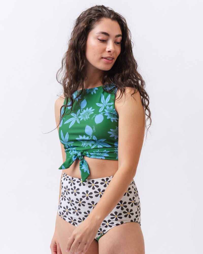 Lime Ricki x Lars Limited Edition Collection! Say hello to our most popular style now in Brazil-inspired Passionfruit print. This sleek boat neck with knotted ties in the front will become your new favorite. Featuring a built-in bra for great support and coverage this crop top works just as well at the gym as it does at the beach.