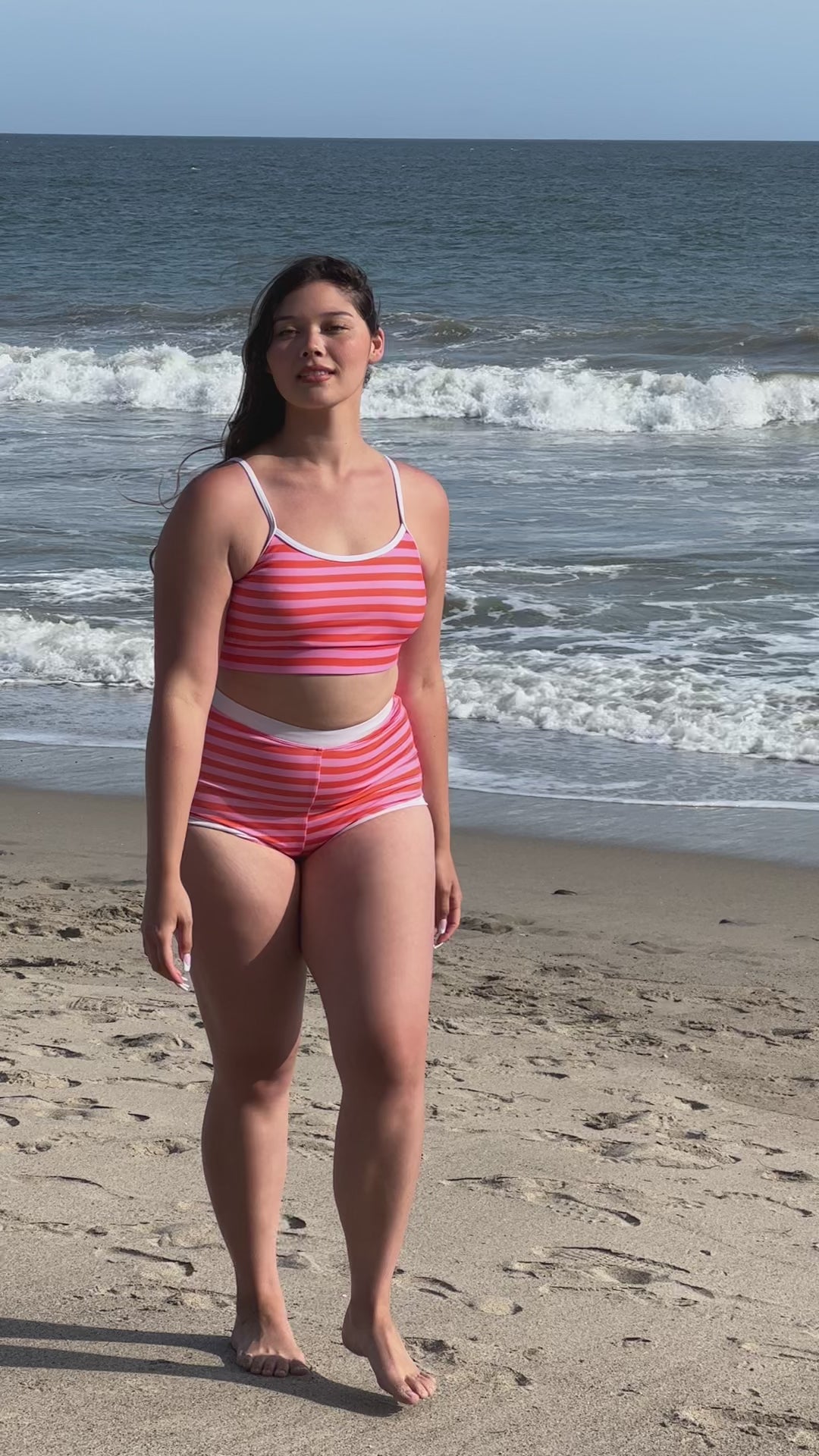 If you're looking for a bottom option with more coverage, you've arrived! Featuring a seamless front and comfortable leg openings, these will have you ready for the pool or beach in no time! The short is in our Sherbet Stripe, trimmed at the waist and legs in our off-white Cloud solid.