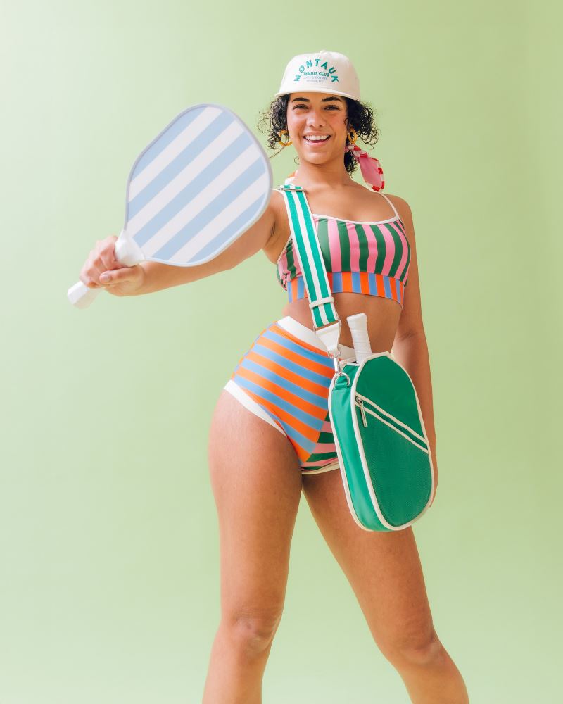 Lime Ricki x Lars Limited Edition Collection! If you're not in love with this bralette yet, you will be! Brazil-inspired Umbrella Stripe in contrasting colors with cream trim and built-in support with bra pads makes this winner. Great as a swim top or as a sports bra. Pair it with any bottom from this collection. We love it as a set with the Umbrella Stripe Retro Boy Short!