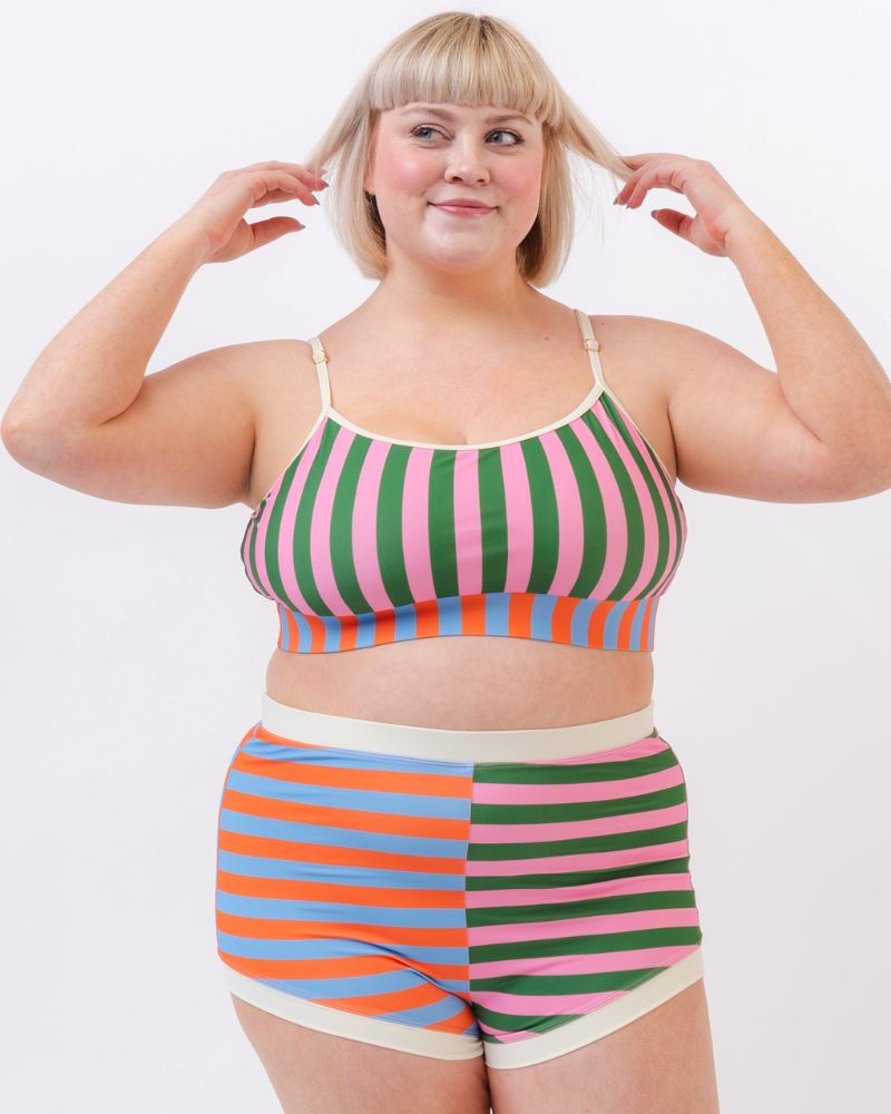 Lime Ricki x Lars Limited Edition Collection! Get more coverage in this retro-inspired boy short in Umbrella Stripe in contrasting color-blocking. Featuring comfortable leg openings and full coverage, trimmed at the waist and legs in our off-white Cloud solid. Pair it with your favorite top from this gorgeous collection. We love it as a set with the Umbrella Stripe Bralette!