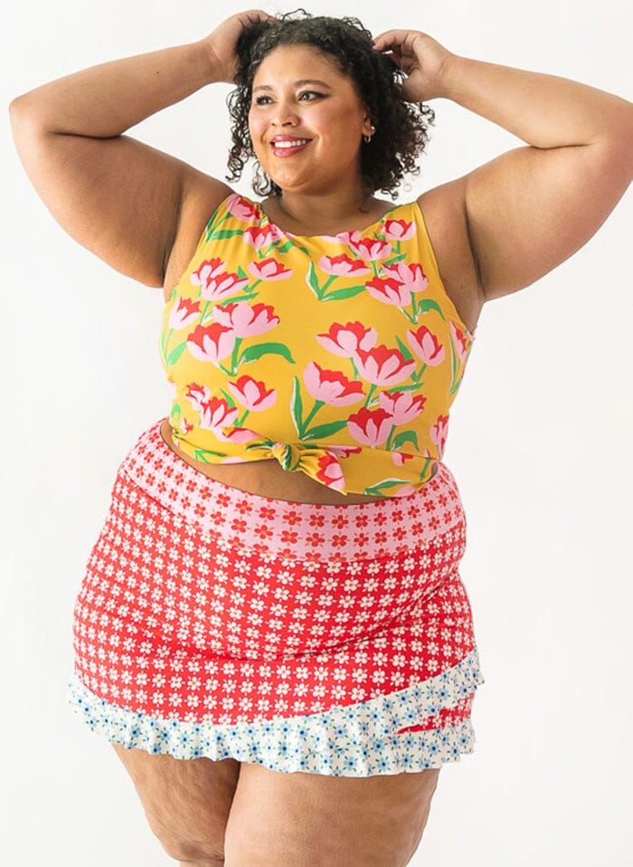 Photo of a woman wearing a Claus swim crop top and a floral swim bottom