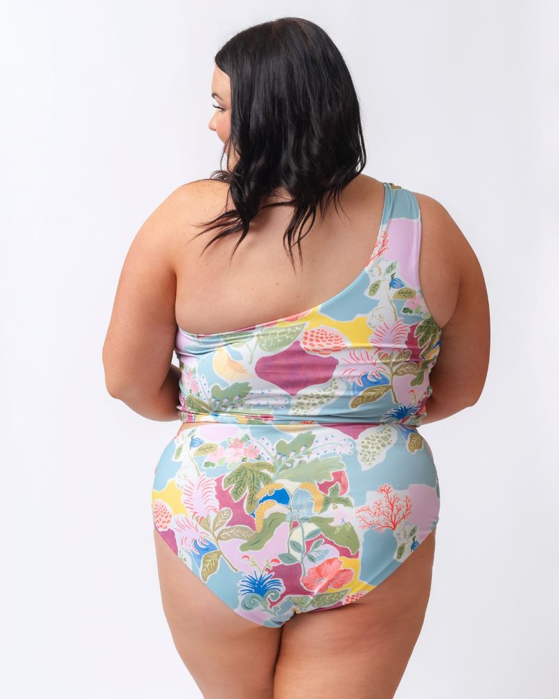 Close up photo of a woman wearing a colorful seashell inspired high waist swim bottom