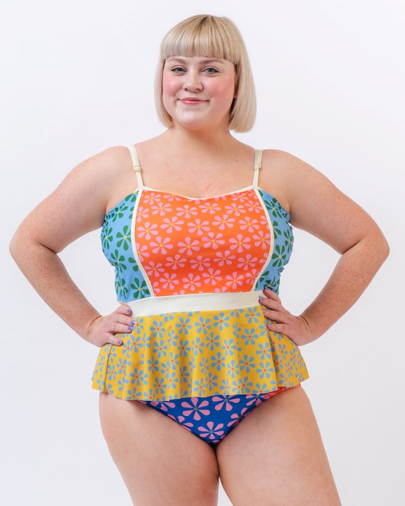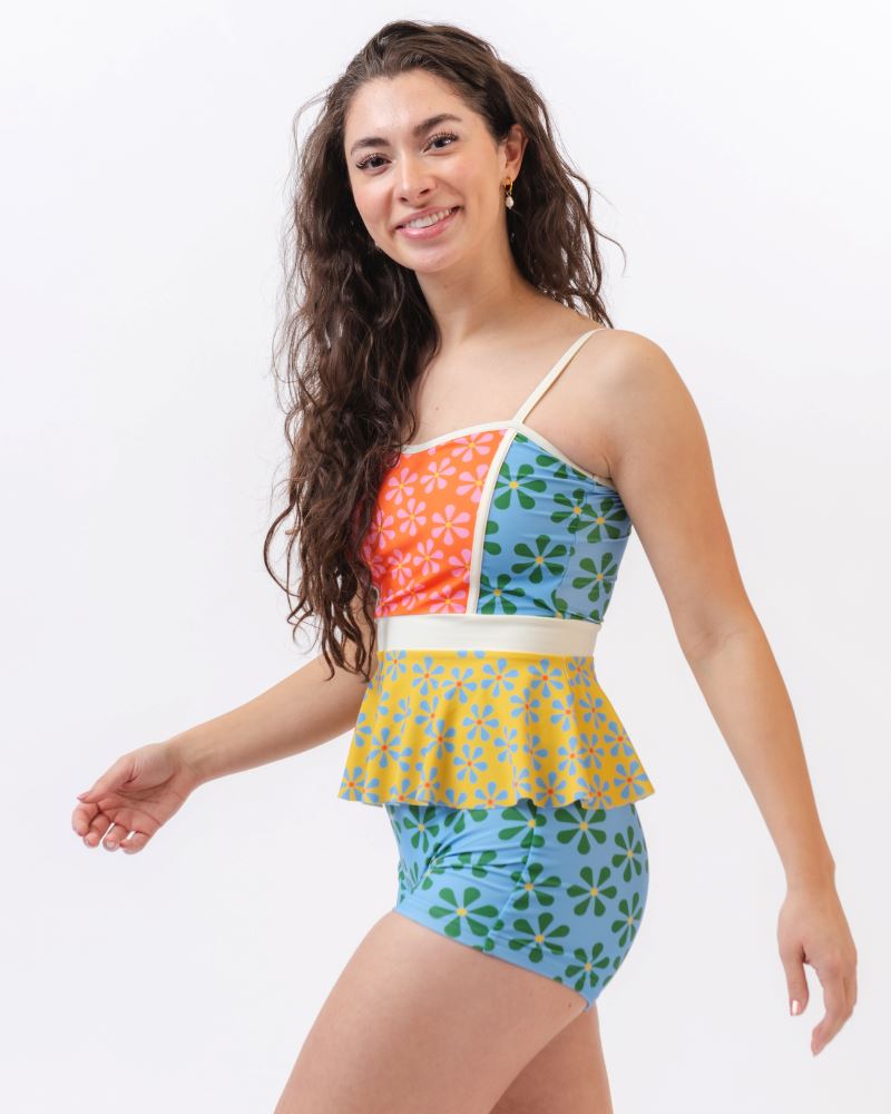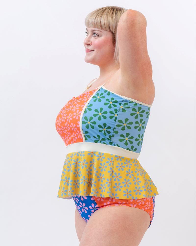 Lime Ricki x Lars Limited Edition Collection! Get excited about this Calcada Peplum, color-blocked in 3 variations of this gorgeous print! It has a built-in shelf bra for support. Adjustable straps and contrasting trim. Pair with your favorite bottom from this collection. A must-have for every swim drawer!