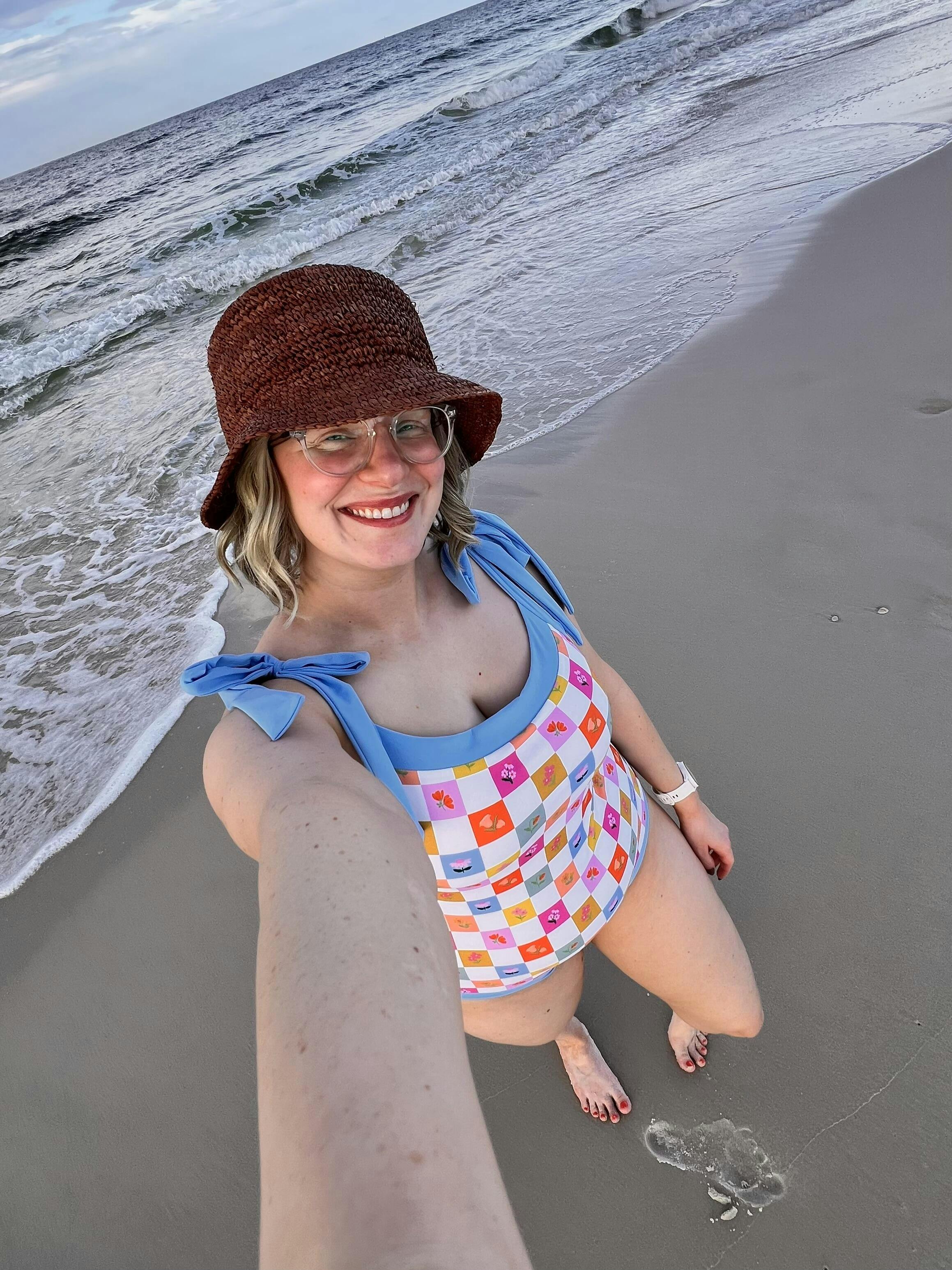 Photo of a woman wearing a colorful seashell inspired shoulder-tie one-piece swim suit