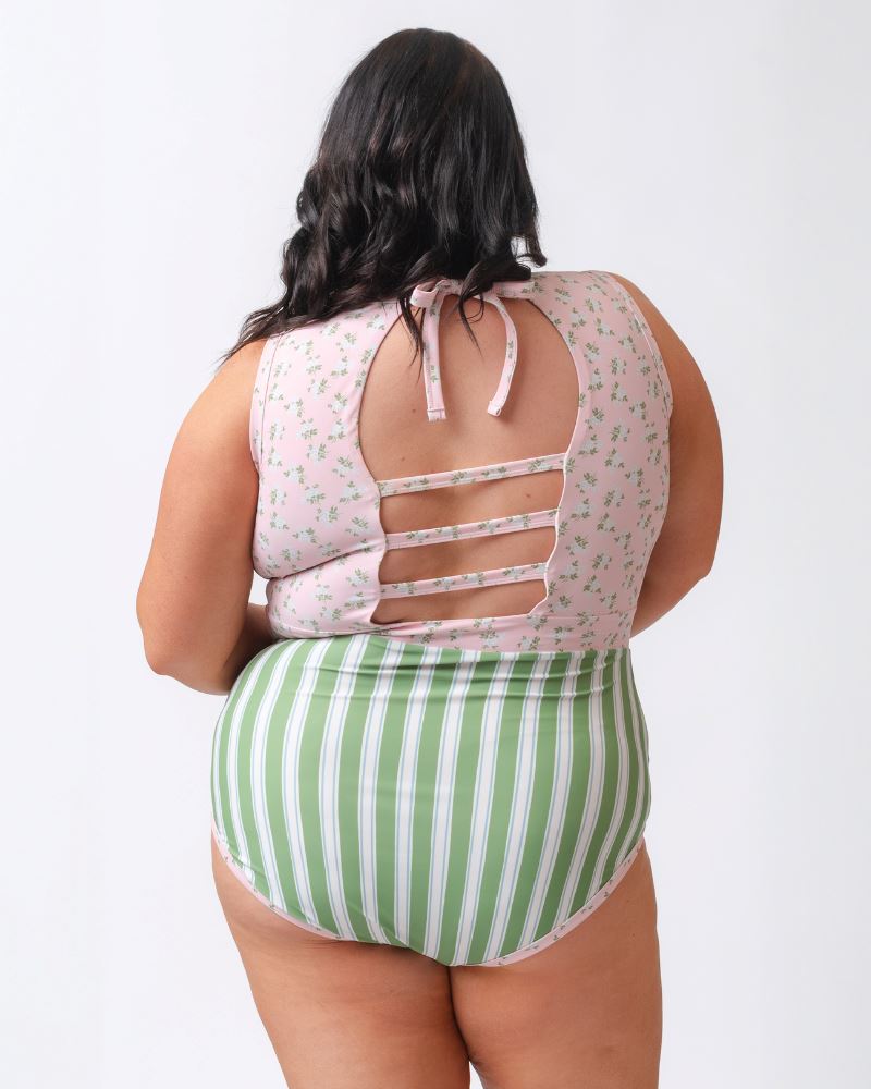 Gorgeous color-blocked one-piece. We paired this feminine Somerset floral paired with Basil stripe. High neck for coverage, straps across the back with a tie and sewn-in bra pads for great support. We cut the leg openings a little higher, still with full coverage in back. Get it while it lasts!