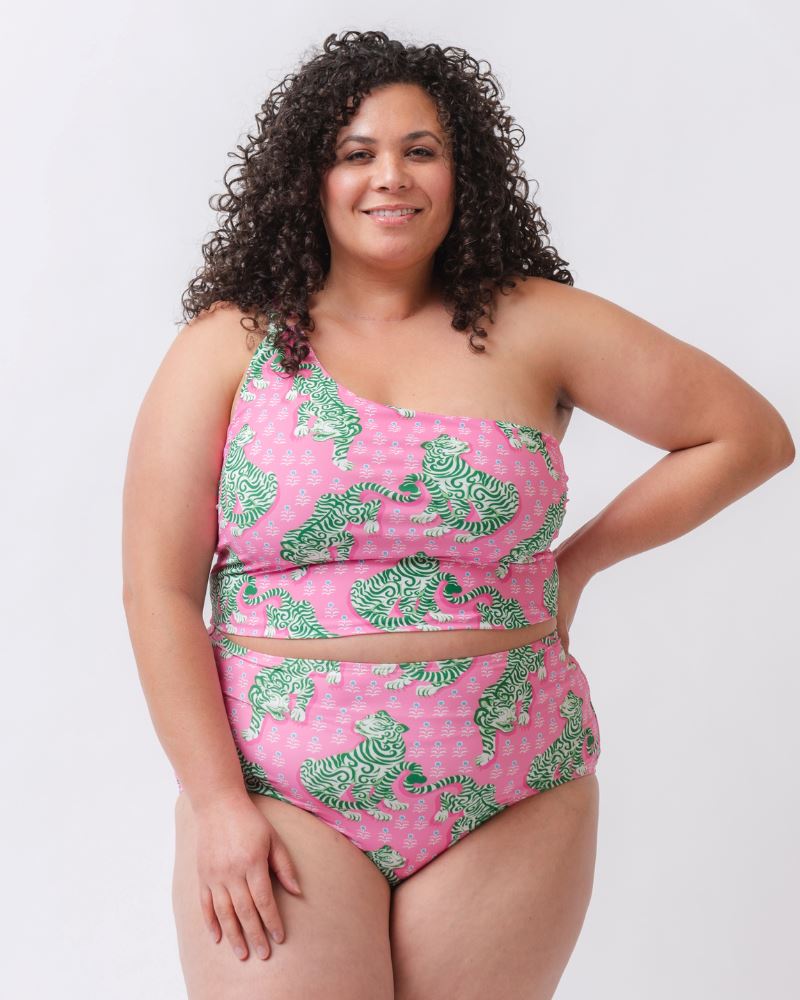 Photo of a woman wearing a bold pink and green tiger print one shoulder crop swim top with matching high waist swim bottoms